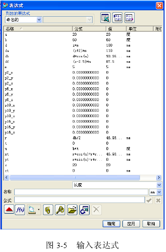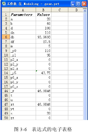 要實(shí)現(xiàn)輪齒完全的參數(shù)化驅(qū)動(dòng),就要運(yùn)用 UG NX 中的表達(dá)式和電子表格。表達(dá)式是定義特征的算術(shù)或條件公式語(yǔ)句[48]。利用表達(dá)式編輯器(ExpressionsEditor)可以為在齒輪中的表達(dá)式定義公式字符串。通過(guò)編輯公式,可以編輯用戶的模型參數(shù)。也可以利用表達(dá)式來(lái)參數(shù)化控制在一個(gè)零件的特征間的關(guān)系。電子表格是 UG NX 用于參數(shù)化建模的高級(jí)表達(dá)式編輯器,為 UG NX 與 Excel 之間提供一個(gè)集成接口,以便用表格驅(qū)動(dòng)的方式實(shí)現(xiàn)關(guān)聯(lián)性設(shè)計(jì)。建模電子表格可實(shí)現(xiàn)較多的功能,如提取和修改表達(dá)式、屬性;利用目標(biāo)搜尋與分析方法求若干幾何參數(shù)的最優(yōu)解;利用部件族功能快速設(shè)計(jì)具有相同結(jié)構(gòu)而不同尺寸的系列零件。因此對(duì)齒輪建模,首先執(zhí)行工具/表達(dá)式命令,在表達(dá)式對(duì)話框中設(shè)置齒輪建模過(guò)程中用到的參數(shù),包括 m (模數(shù))、z (齒數(shù))、α(壓力角)、b(展開角)等,按式(3-2)輸入公式,見圖 3-5,然后按規(guī)定步驟完成建模。       執(zhí)行工具/電子表格命令,打開 Excel,選擇抽取表達(dá)式命令,則模型中的表達(dá)式被抽取到電子表格中,見圖 3-6,修改 Excel 表中的 m、z 等,即可生成結(jié)構(gòu)相同尺寸不同的齒輪,擴(kuò)充實(shí)例庫(kù)內(nèi)容。 1.2傳動(dòng)軸模塊實(shí)例的創(chuàng)建