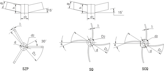 四葉后掠整體式-SQ、四葉后掠可拆式-SCQ、三葉錐底平槳式-SZP