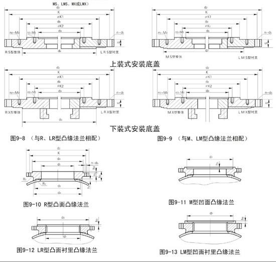 本系列安裝底蓋可與XD與型、XS型機架及2000系列機械密封火506、516、616型填料箱相配套,底蓋下面與R型、LR型、M型、LM型凸緣法蘭相配套,用戶根據(jù)XD型、XS型機架及凸緣法蘭的規(guī)格選擇相應的安裝底蓋,若配用其他型號機架、機械密封、填料箱,只需將一下標記中序號換成外徑d,注上相應機架型號即可。