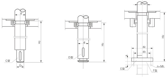 攪拌軸釜內(nèi)部分的聯(lián)結(jié)形式(C:配DT型剛性凸緣聯(lián)軸器;D:配JQ或JJQ型夾殼聯(lián)軸器;E:帶焊接法蘭式聯(lián)軸器;F:帶整體法蘭式聯(lián)軸器;G:整體軸,無釜內(nèi)聯(lián)軸器)